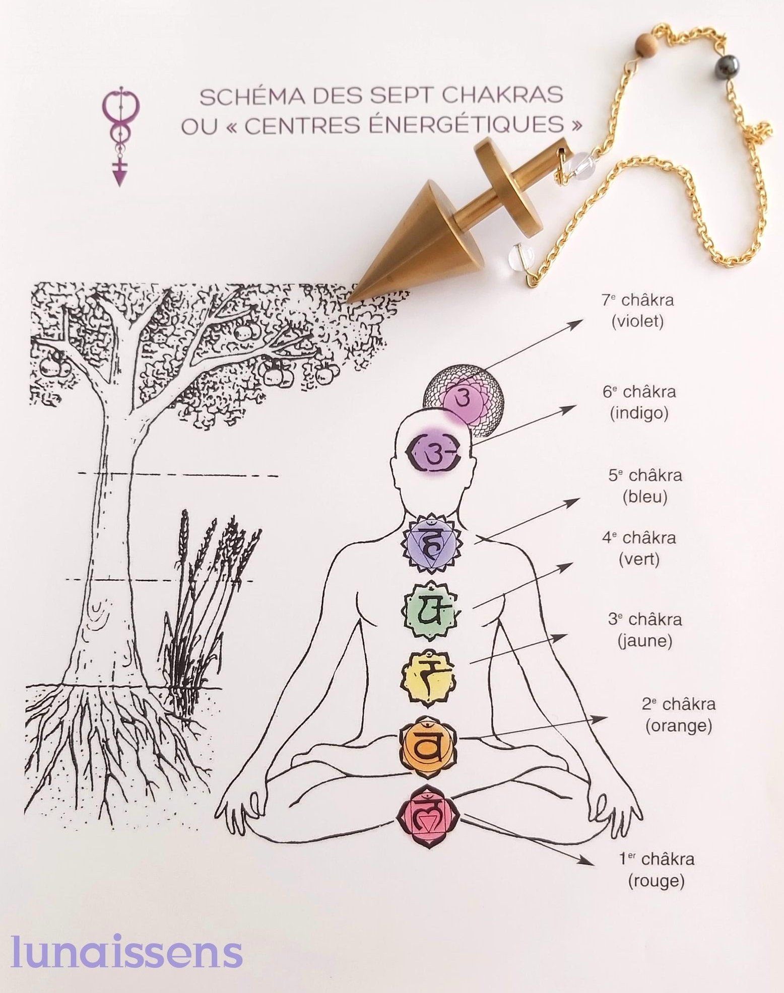 Chakra racine, chakra sacré, chakra solaire, chakra coeur, chakra gorge, chakra 3ème œil, chakra coronal.